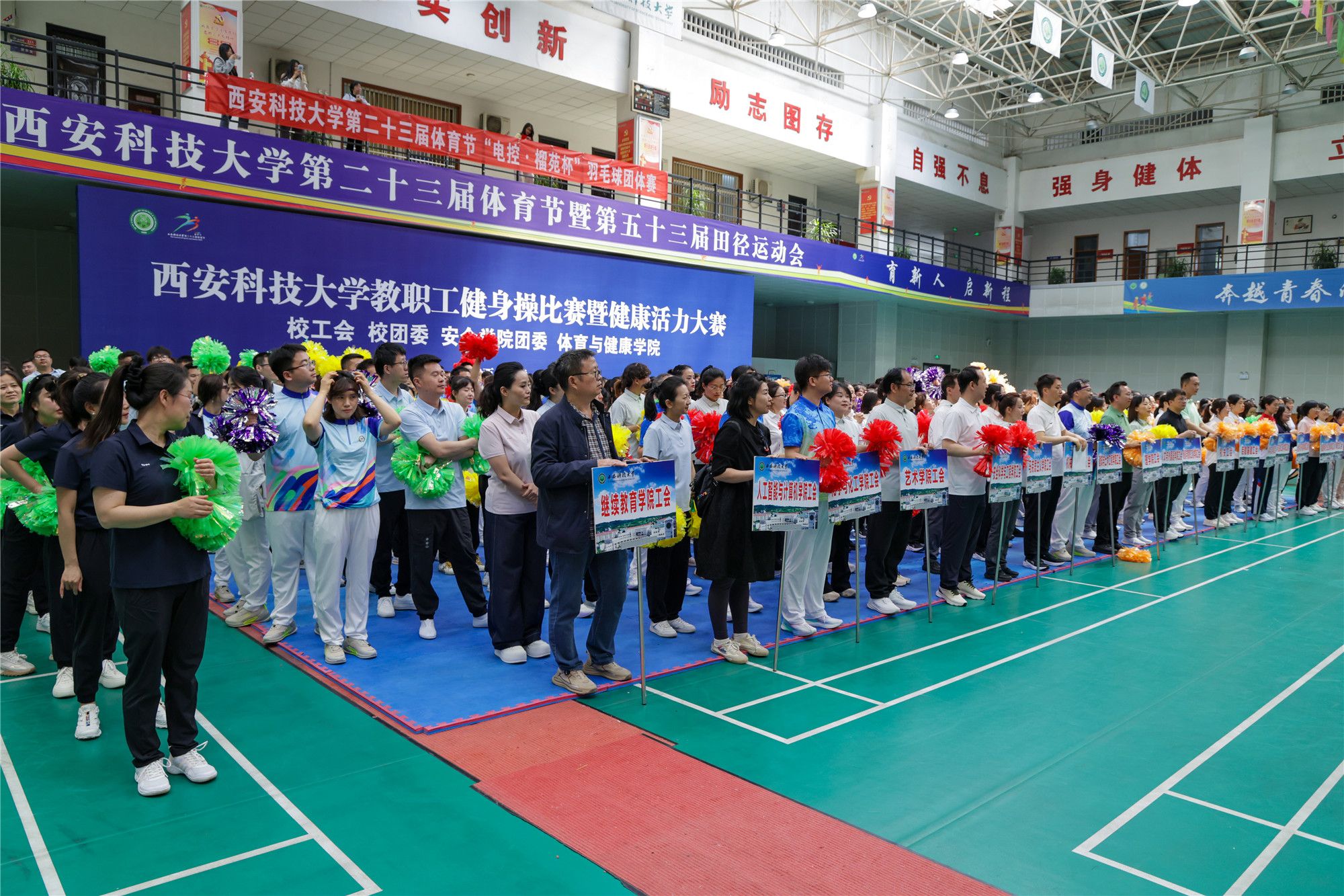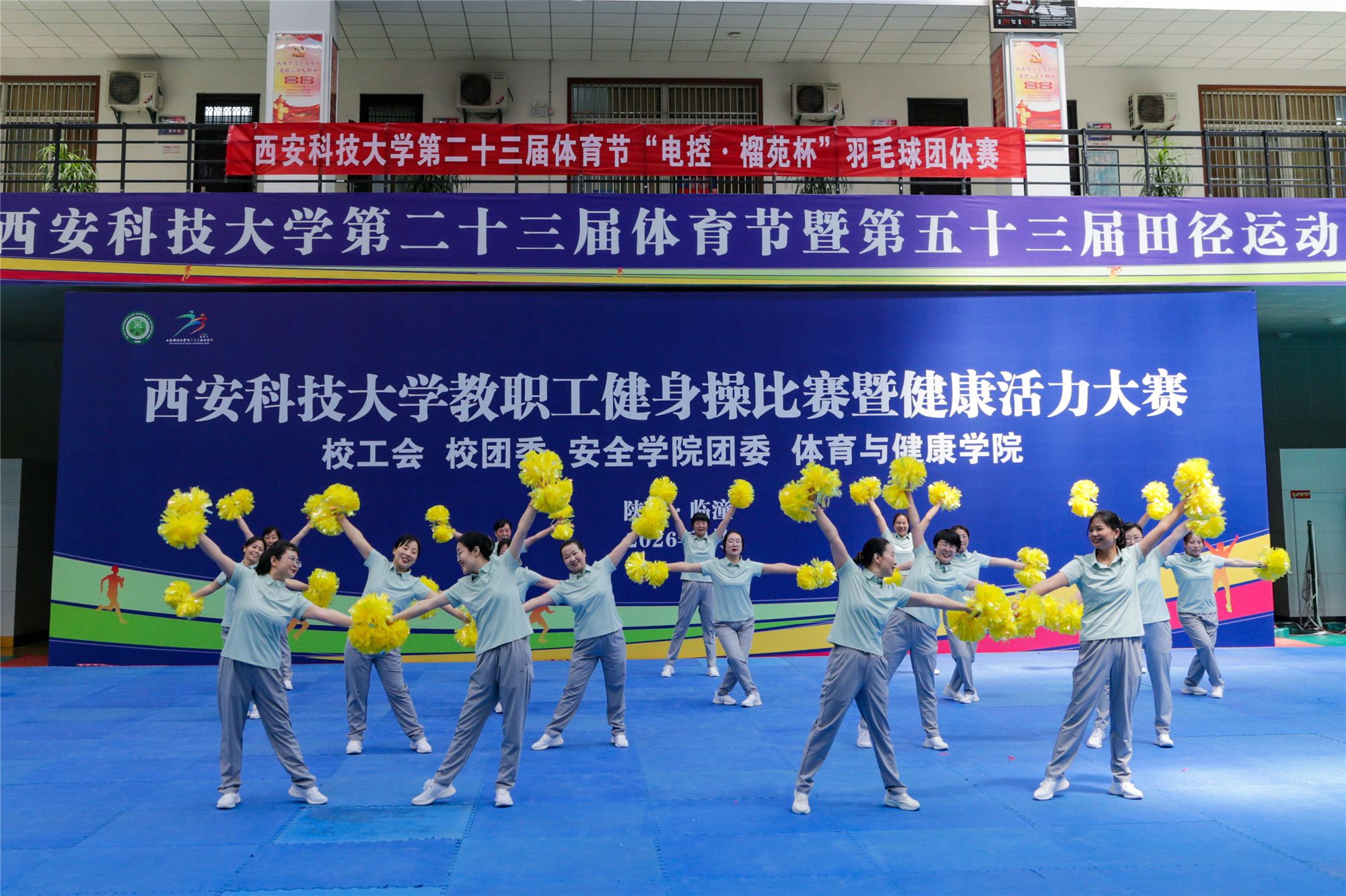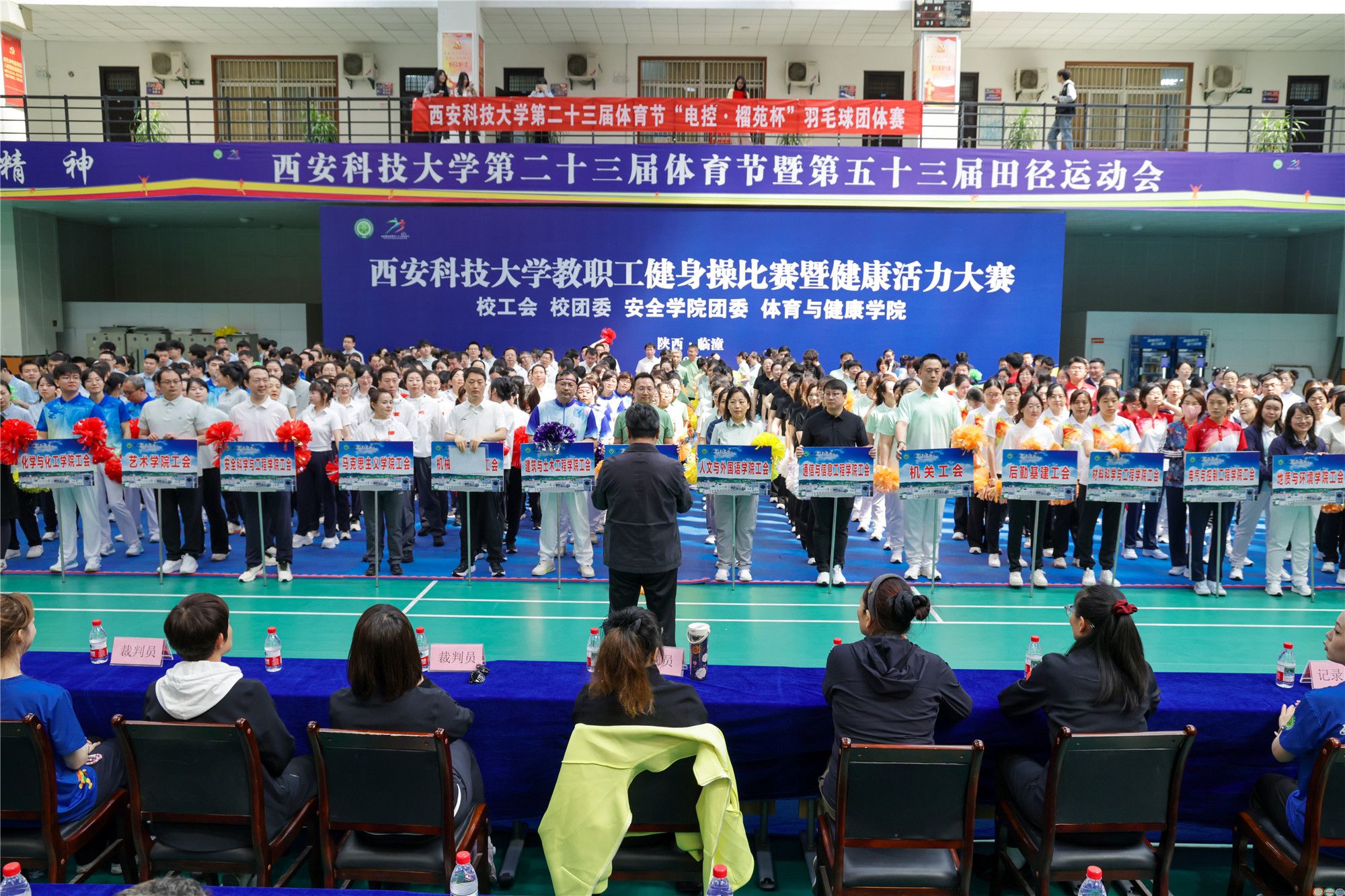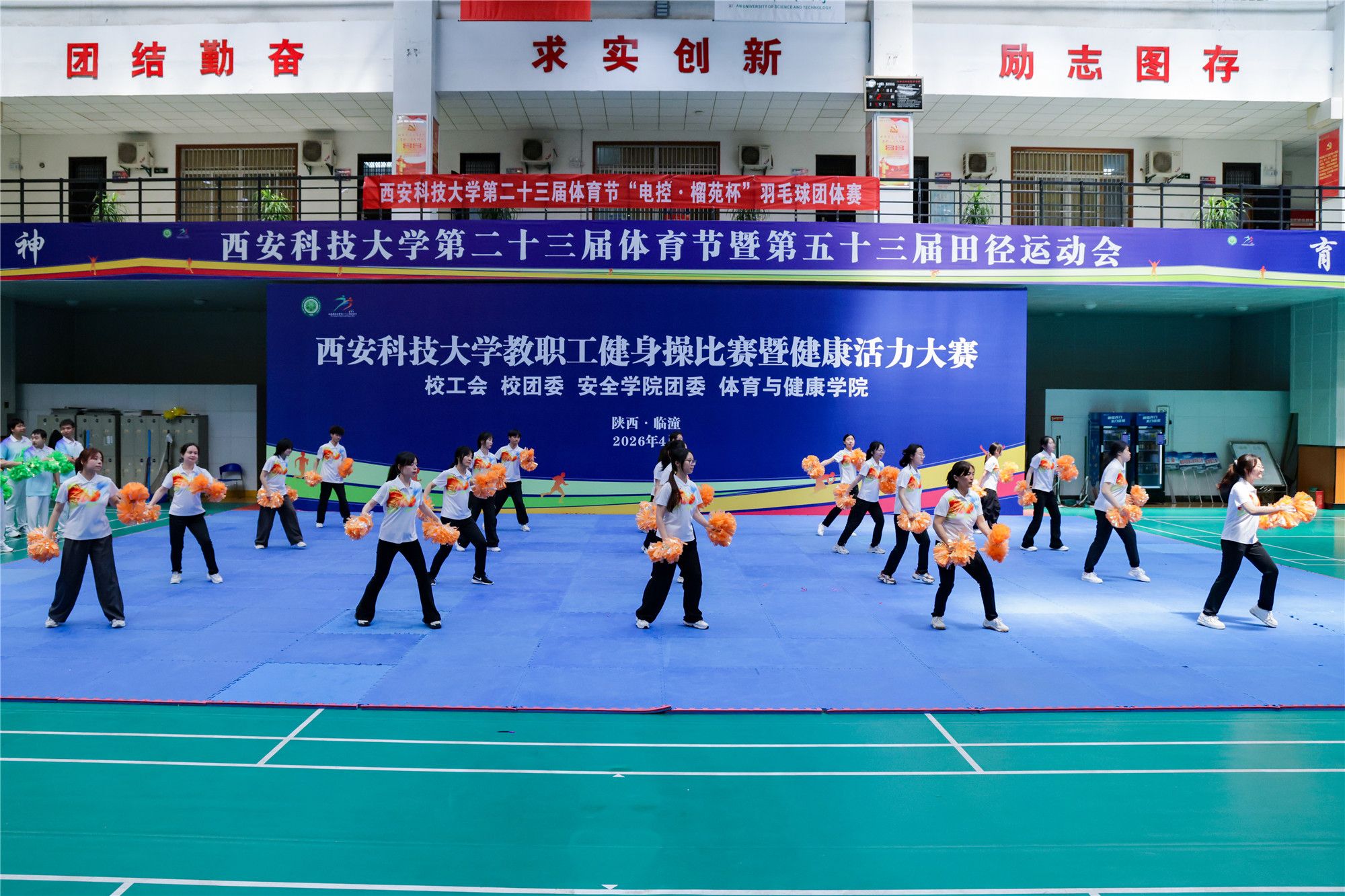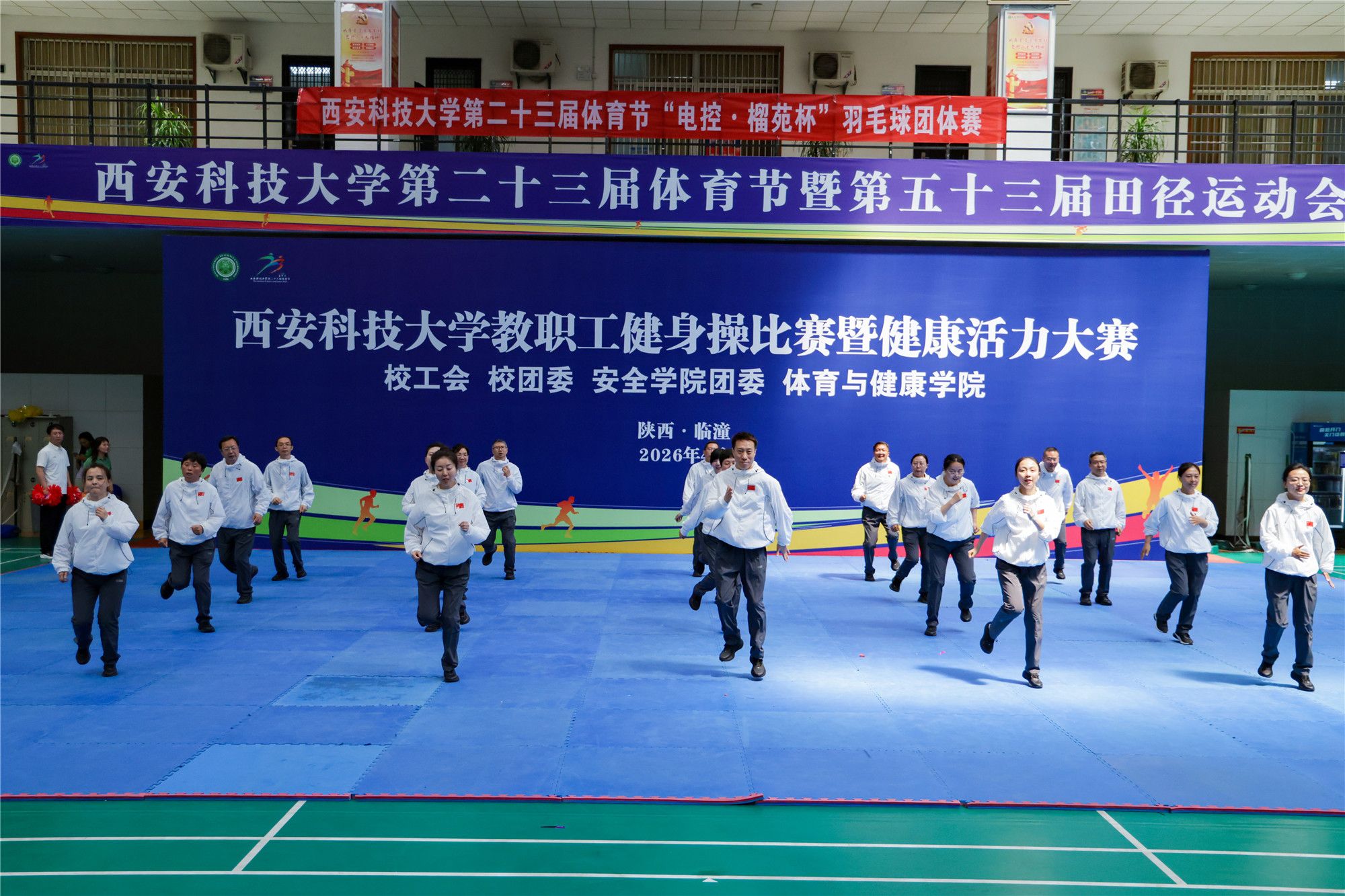 为深入实施全民健身战略,丰富校园文化生活,展现新时代教职工昂扬向上、团结奋进的精神风貌,4月23日,西安科技大学2026年第三届教职工团体健身操比赛在临潼校区骊山校园体育馆隆重举行。校党委书记来兴平,校长邓军,校党委副书记陈春林,校党委副书记、纪委书记、省纪委监委驻校纪检监察组组长沙德忠,副校长罗振敏出席活动。比赛由校工会主办,体育与健康学院协办,吸引全校20个分工会、430余名教职工踊跃参与,现场星光闪耀、气氛热烈高涨。