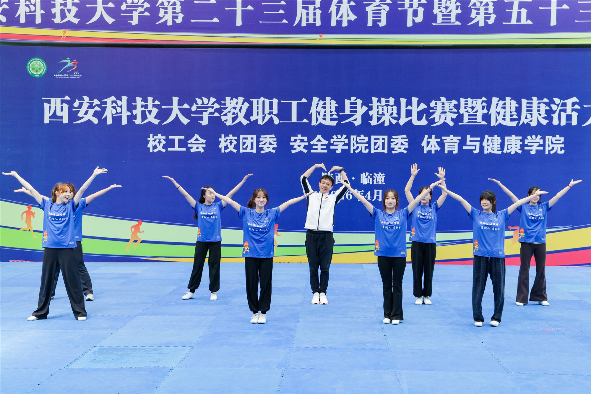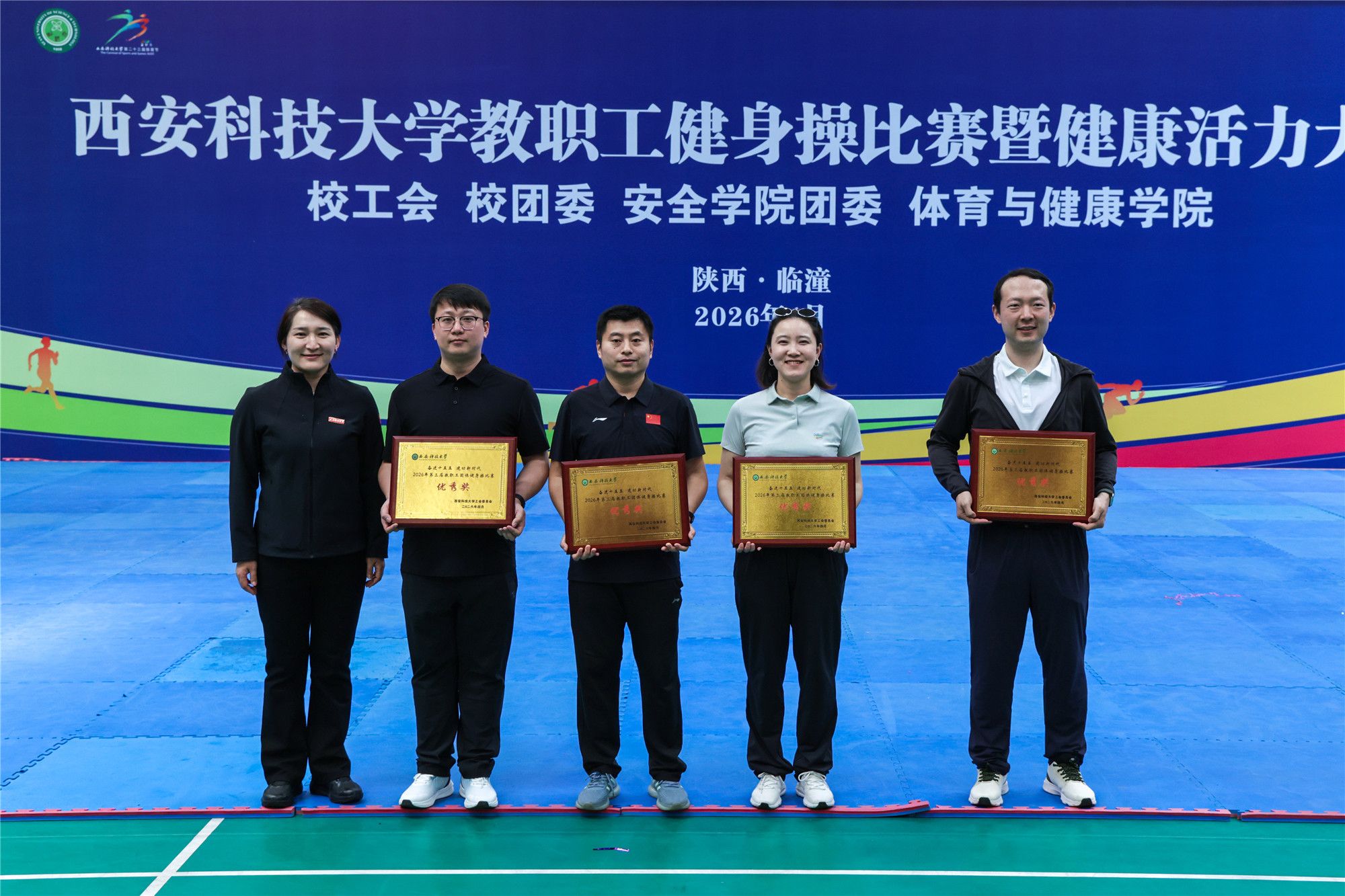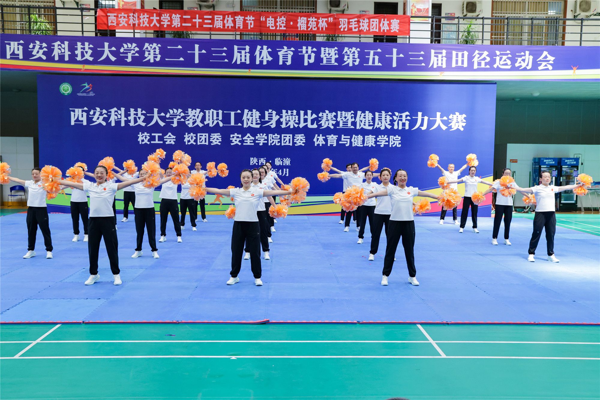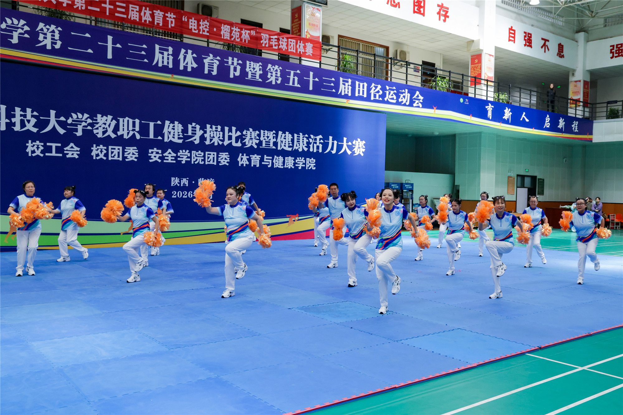 为深入实施全民健身战略,丰富校园文化生活,展现新时代教职工昂扬向上、团结奋进的精神风貌,4月23日,西安科技大学2026年第三届教职工团体健身操比赛在临潼校区骊山校园体育馆隆重举行。校党委书记来兴平,校长邓军,校党委副书记陈春林,校党委副书记、纪委书记、省纪委监委驻校纪检监察组组长沙德忠,副校长罗振敏出席活动。比赛由校工会主办,体育与健康学院协办,吸引全校20个分工会、430余名教职工踊跃参与,现场星光闪耀、气氛热烈高涨。