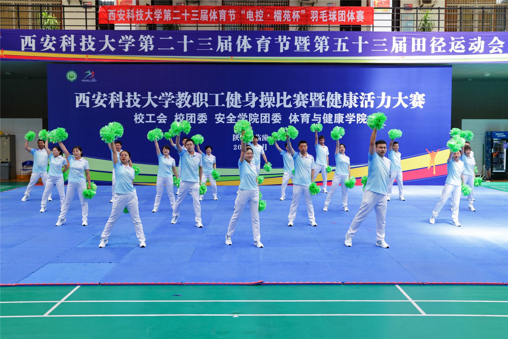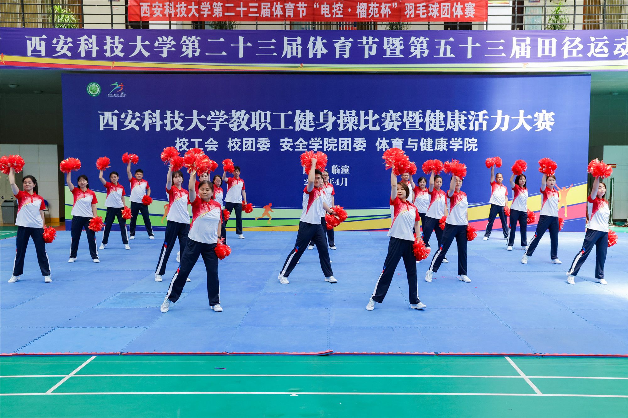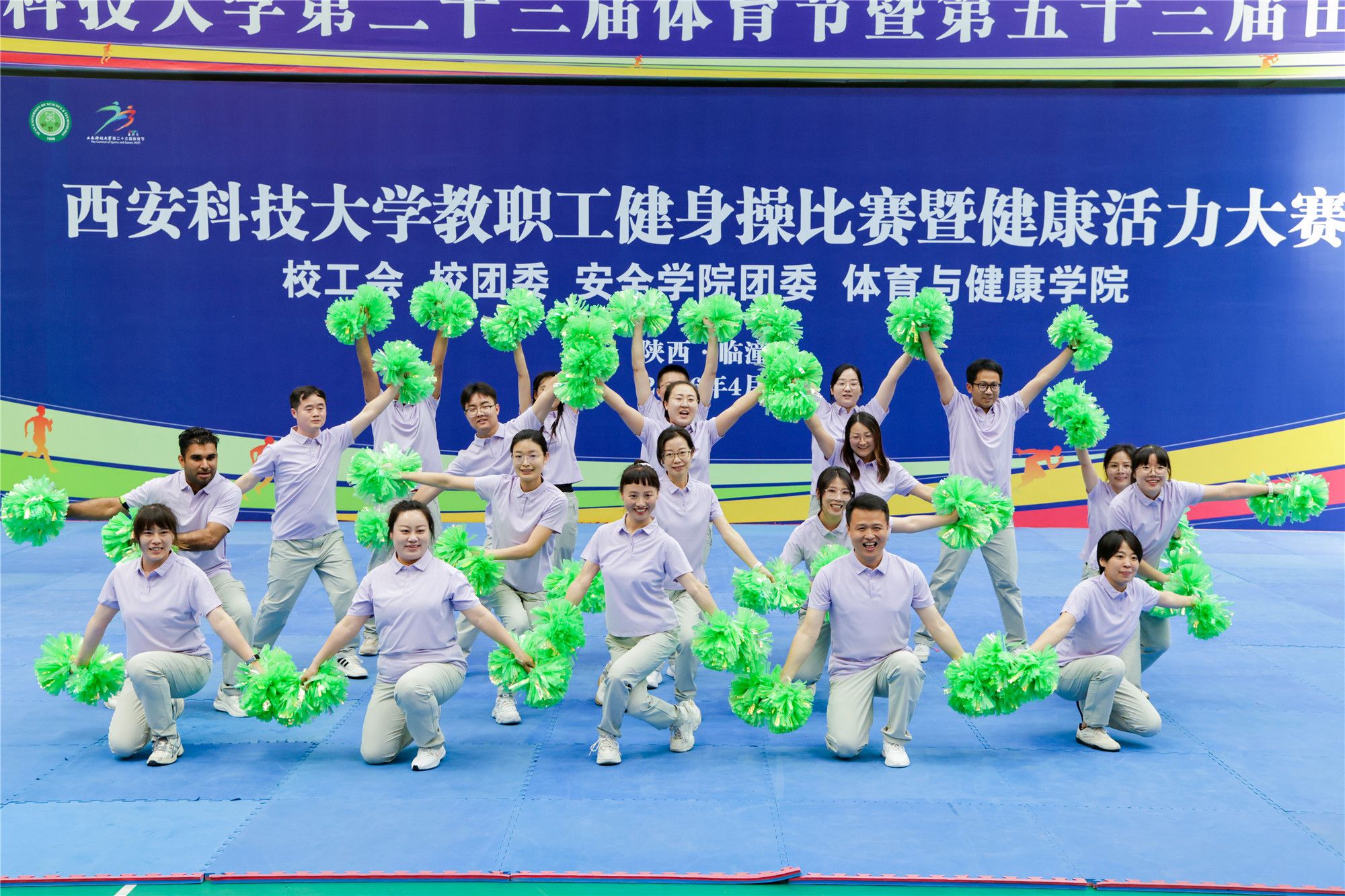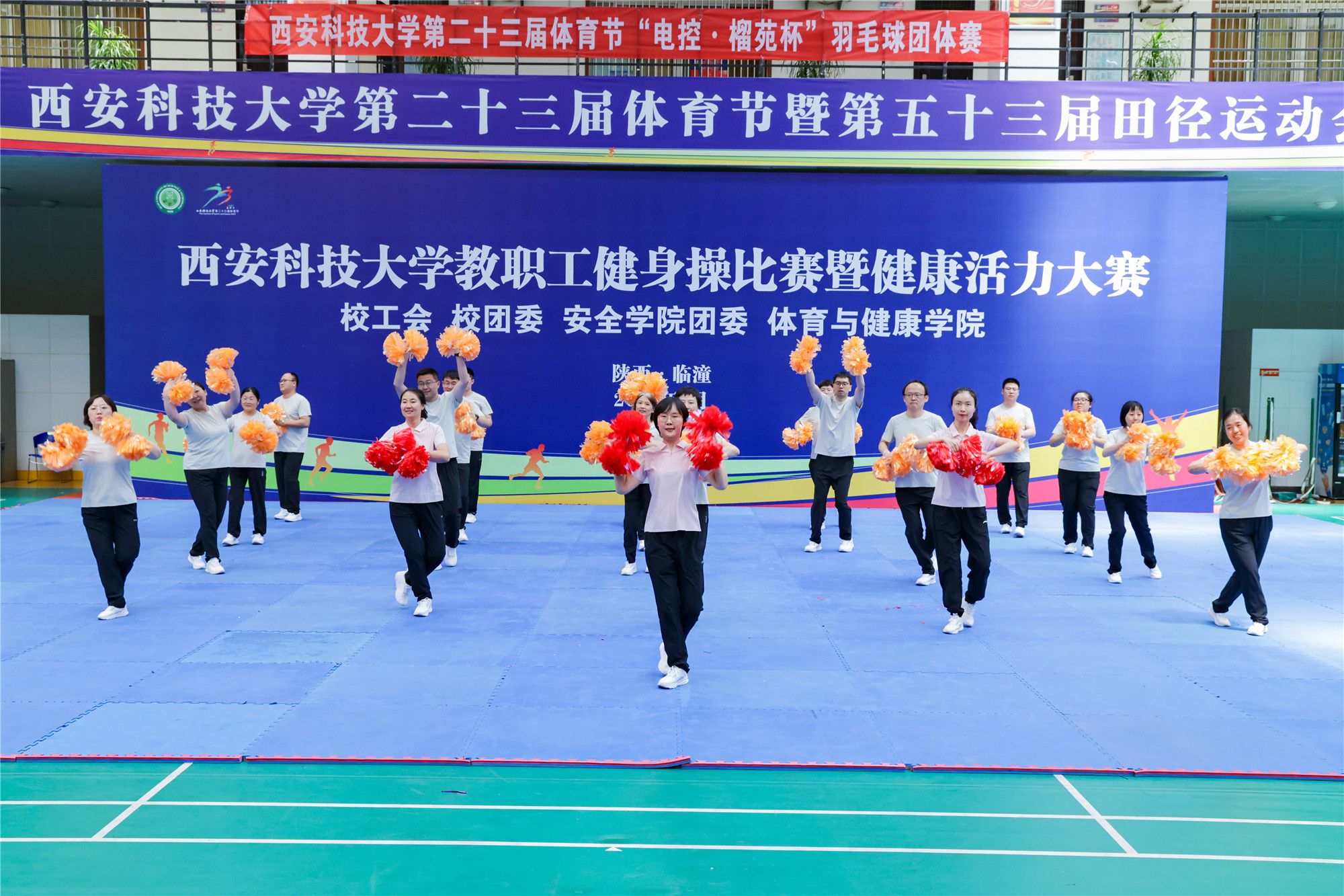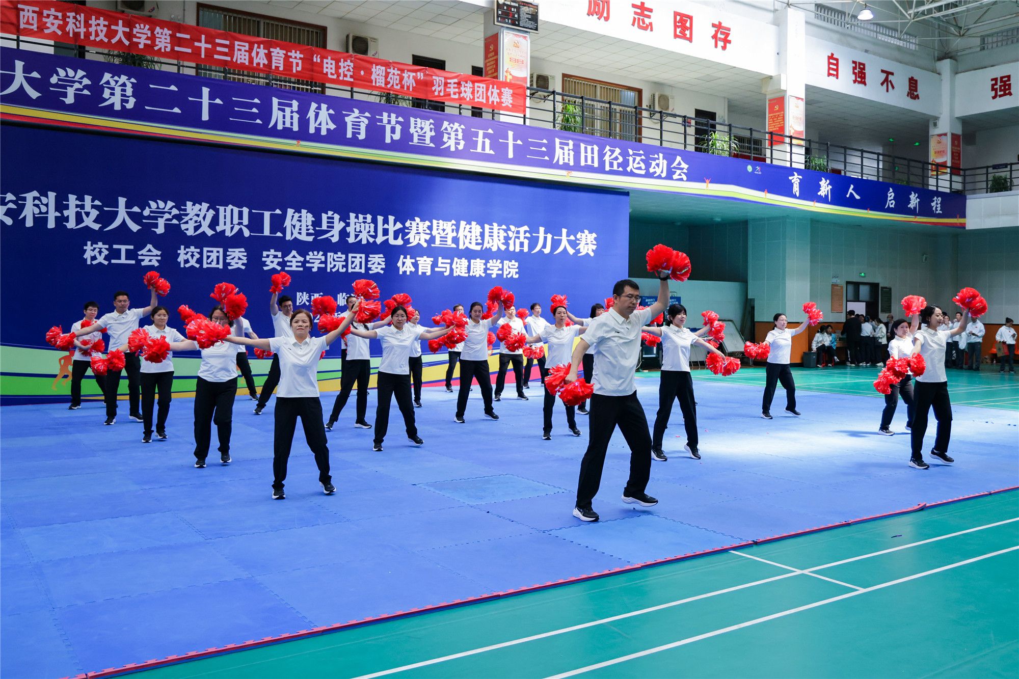 为深入实施全民健身战略,丰富校园文化生活,展现新时代教职工昂扬向上、团结奋进的精神风貌,4月23日,西安科技大学2026年第三届教职工团体健身操比赛在临潼校区骊山校园体育馆隆重举行。校党委书记来兴平,校长邓军,校党委副书记陈春林,校党委副书记、纪委书记、省纪委监委驻校纪检监察组组长沙德忠,副校长罗振敏出席活动。比赛由校工会主办,体育与健康学院协办,吸引全校20个分工会、430余名教职工踊跃参与,现场星光闪耀、气氛热烈高涨。