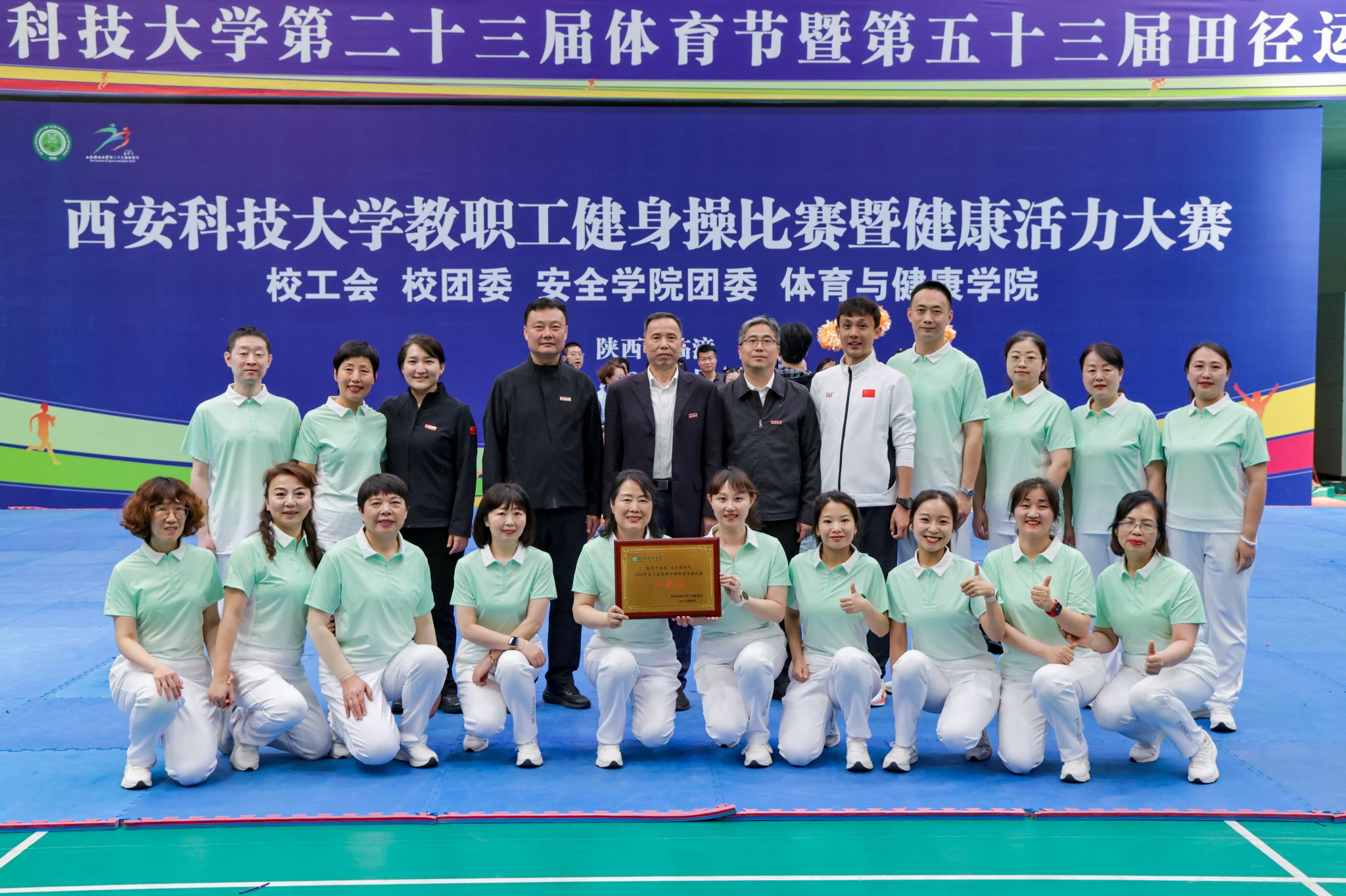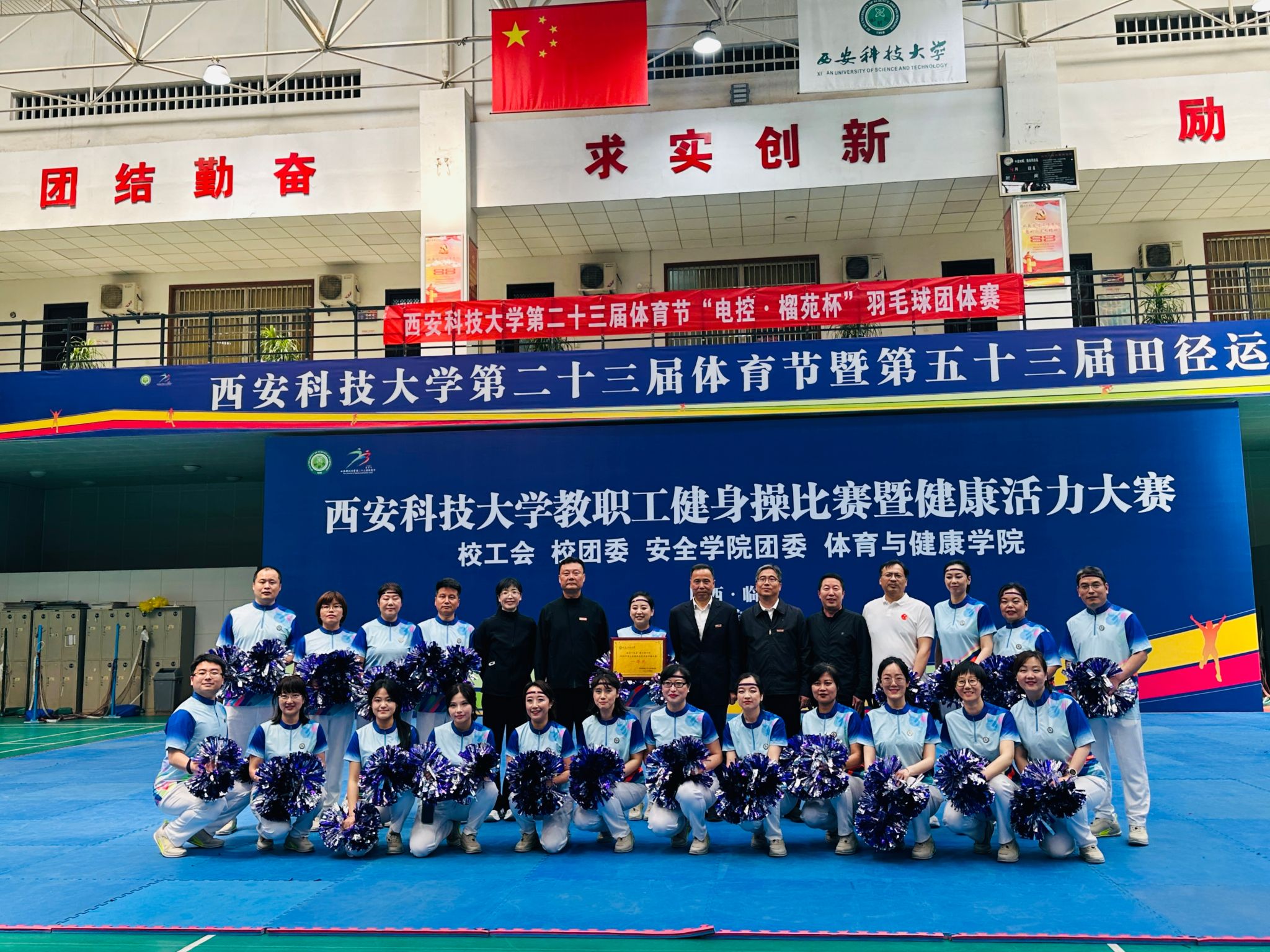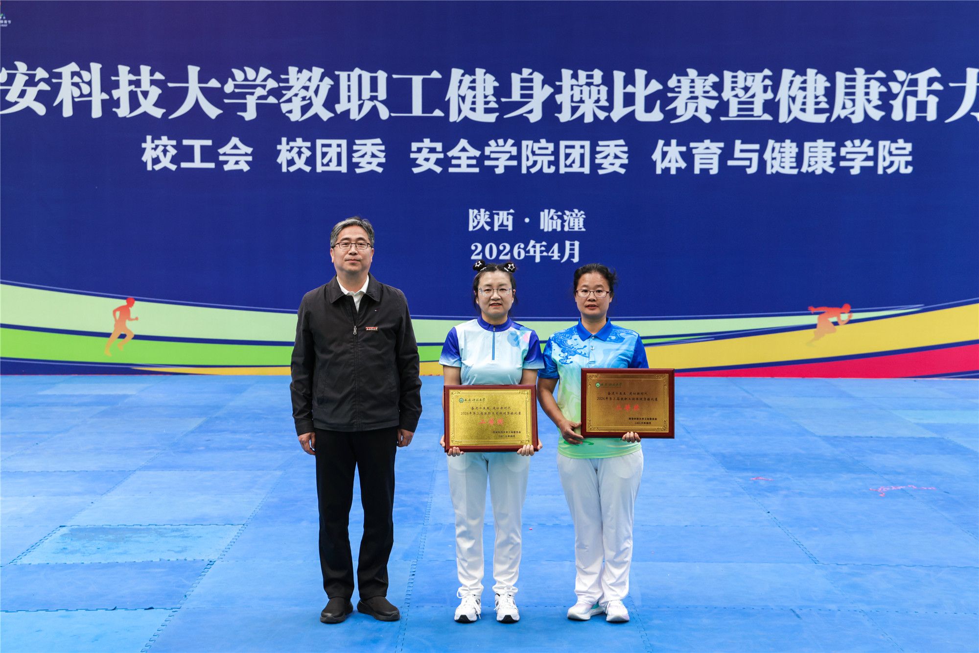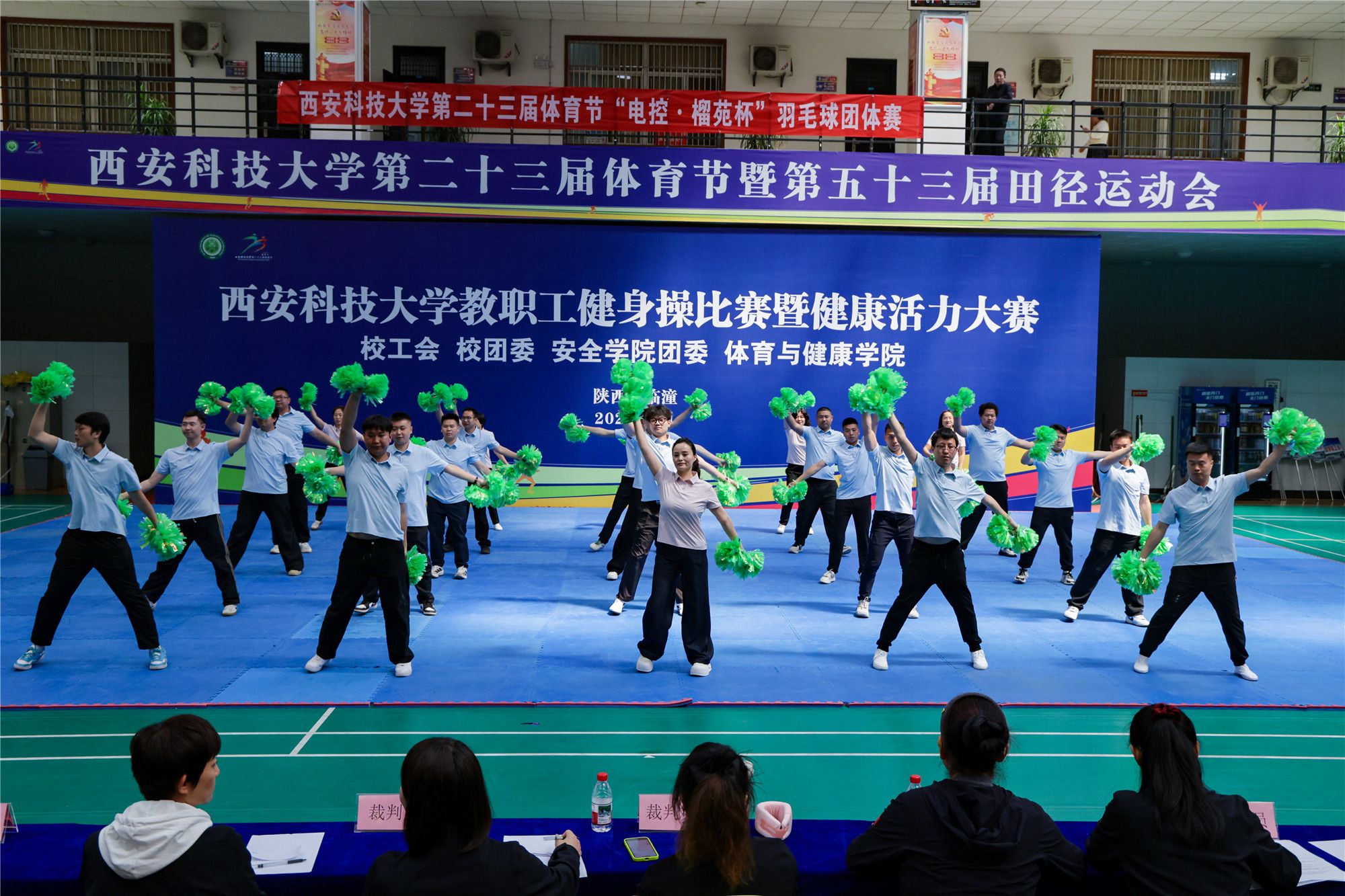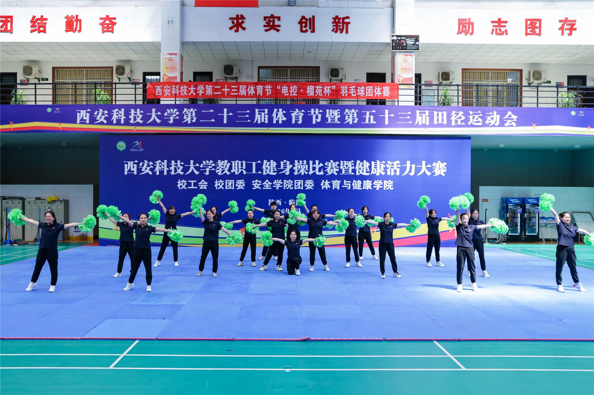 为深入实施全民健身战略,丰富校园文化生活,展现新时代教职工昂扬向上、团结奋进的精神风貌,4月23日,西安科技大学2026年第三届教职工团体健身操比赛在临潼校区骊山校园体育馆隆重举行。校党委书记来兴平,校长邓军,校党委副书记陈春林,校党委副书记、纪委书记、省纪委监委驻校纪检监察组组长沙德忠,副校长罗振敏出席活动。比赛由校工会主办,体育与健康学院协办,吸引全校20个分工会、430余名教职工踊跃参与,现场星光闪耀、气氛热烈高涨。