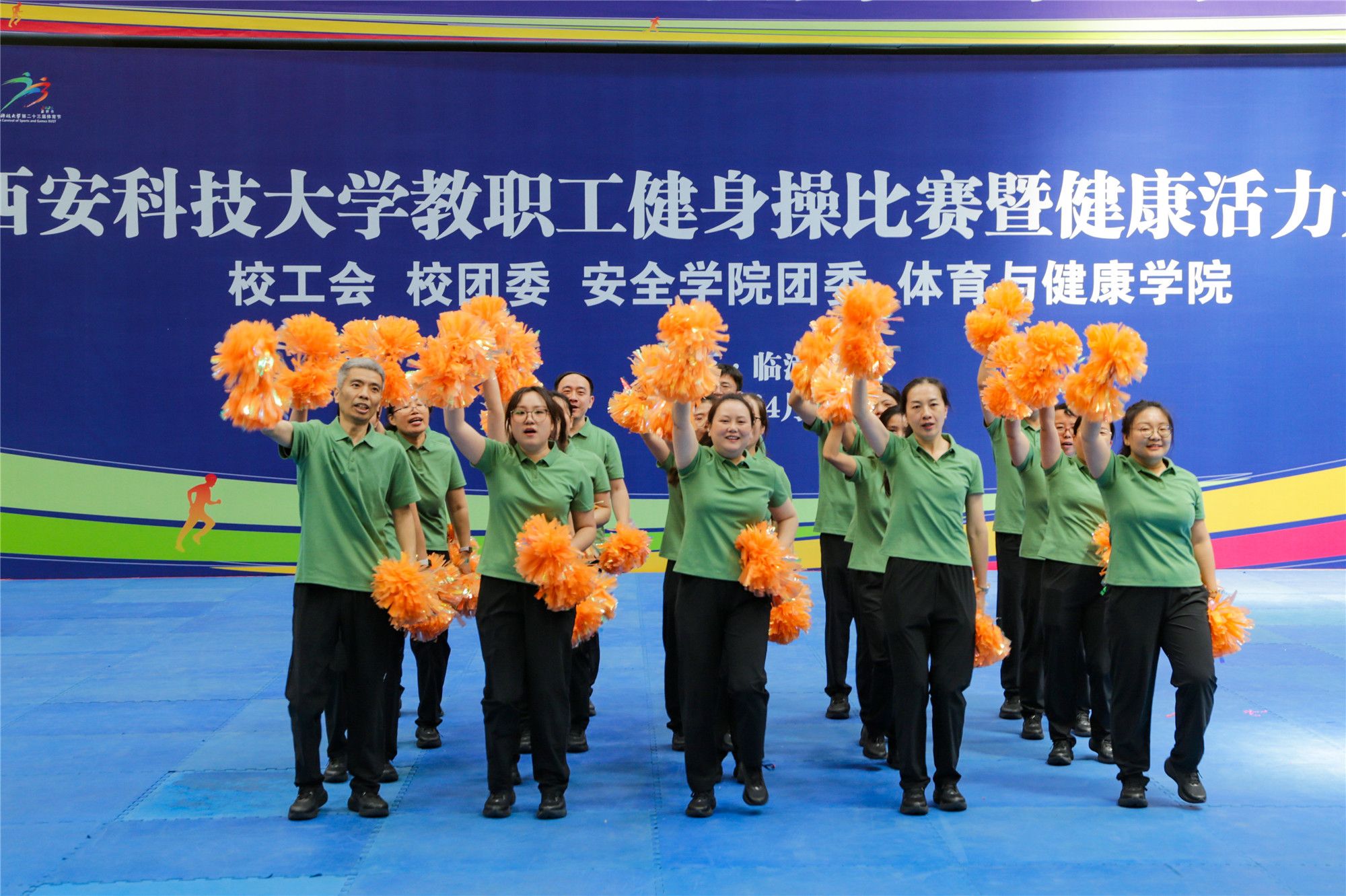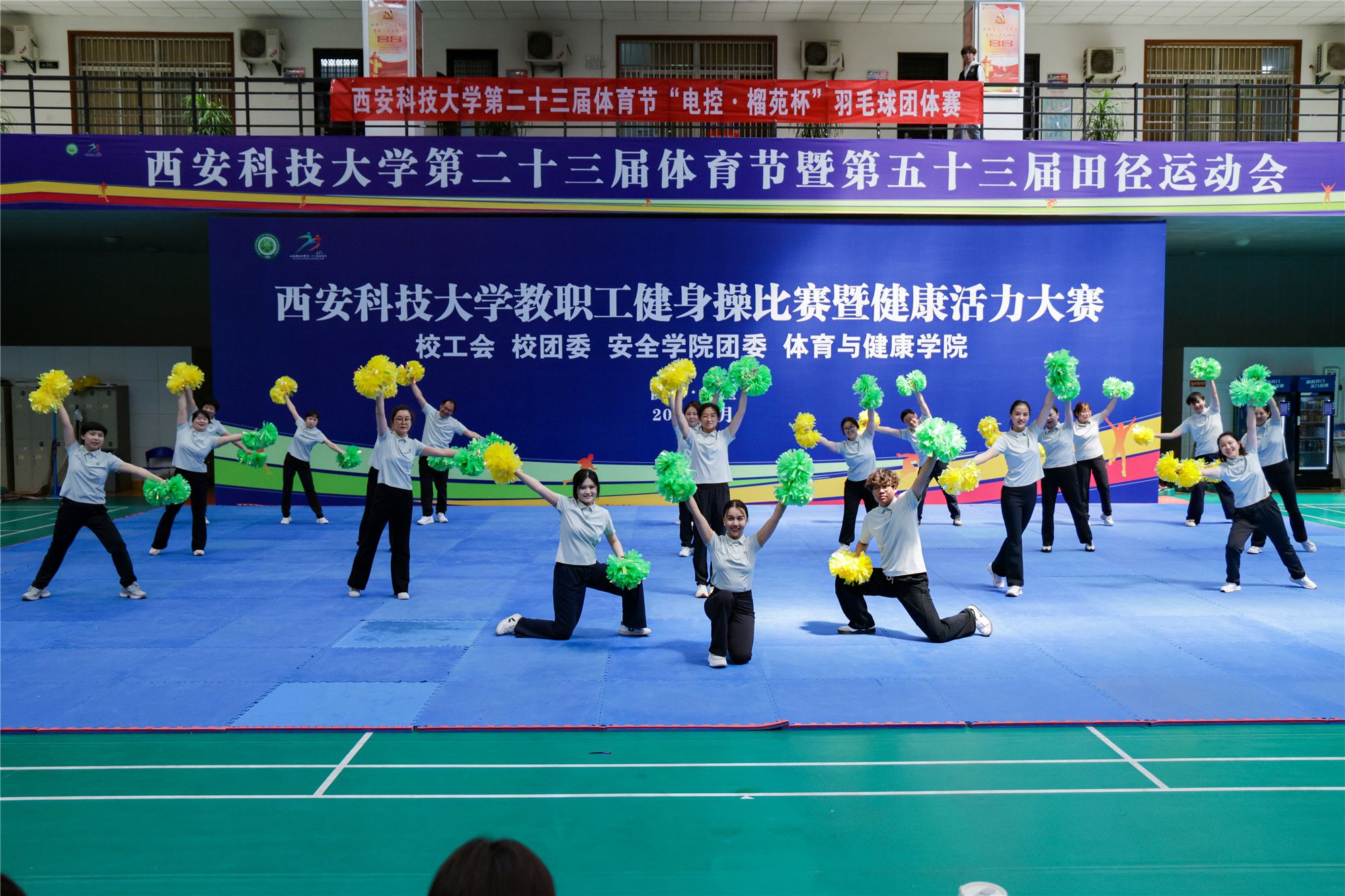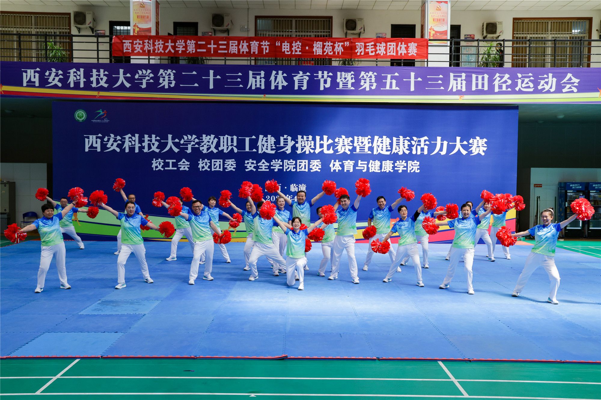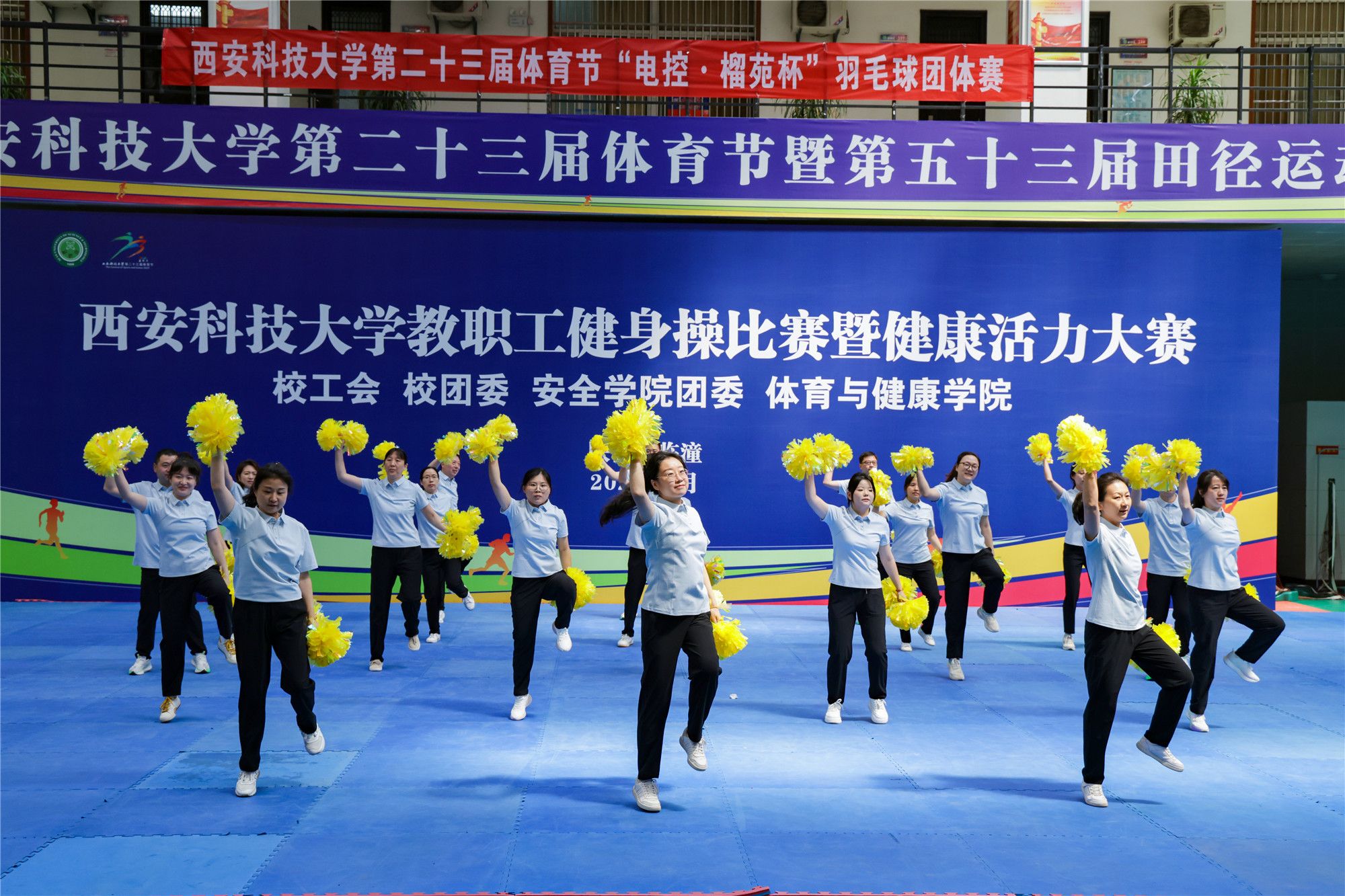 为深入实施全民健身战略,丰富校园文化生活,展现新时代教职工昂扬向上、团结奋进的精神风貌,4月23日,西安科技大学2026年第三届教职工团体健身操比赛在临潼校区骊山校园体育馆隆重举行。校党委书记来兴平,校长邓军,校党委副书记陈春林,校党委副书记、纪委书记、省纪委监委驻校纪检监察组组长沙德忠,副校长罗振敏出席活动。比赛由校工会主办,体育与健康学院协办,吸引全校20个分工会、430余名教职工踊跃参与,现场星光闪耀、气氛热烈高涨。