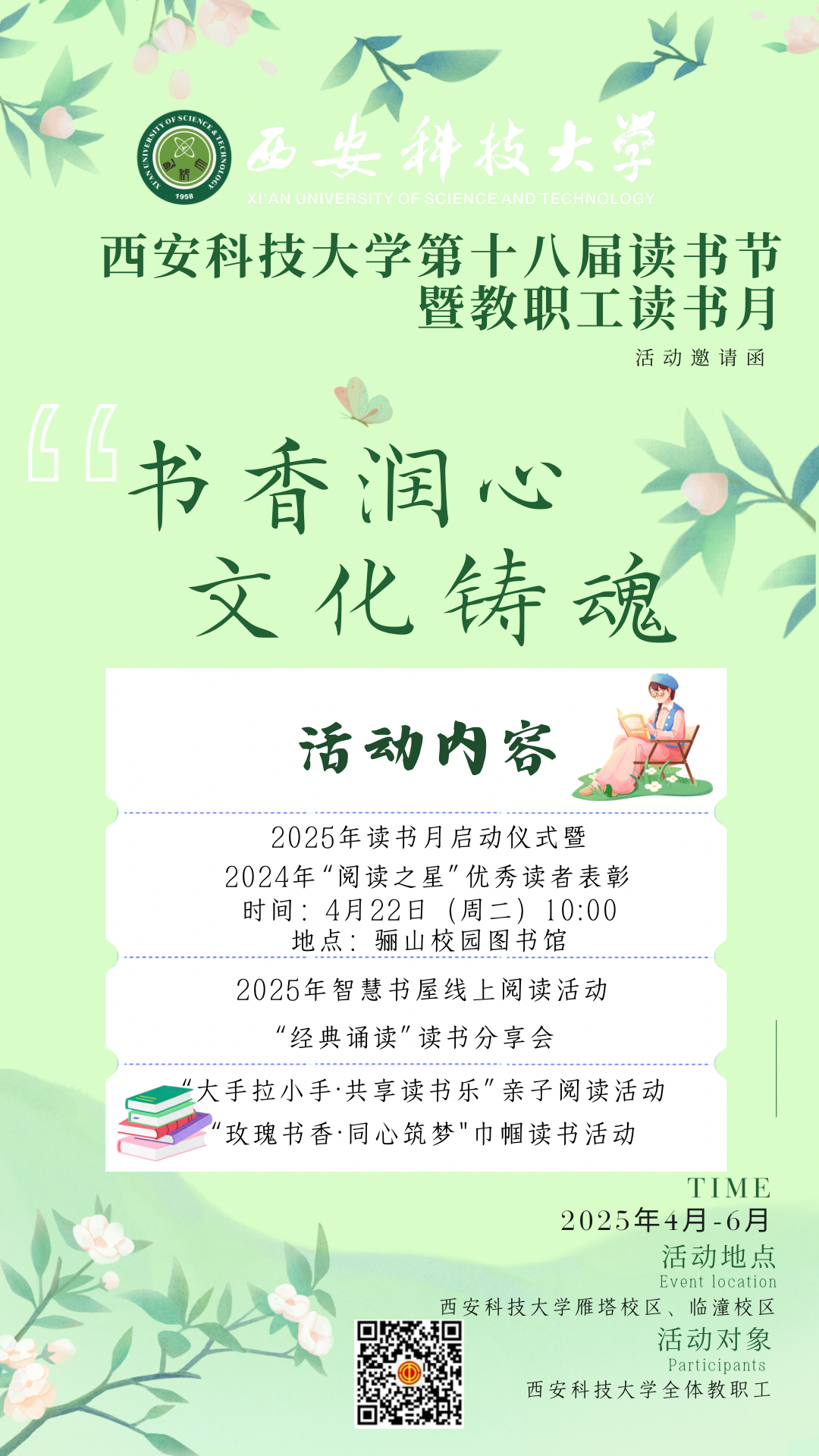 为贯彻落实“深化全民阅读活动”文化发展战略,营造校园全民阅读,文化育人的良好氛围,助力数字时代师生信息素养提升,在第三十个“世界读书日”来临之际,经研究决定举办西安科技大学第十八届读书节暨教职工读书月系列活动,现就有关事宜通知如下: